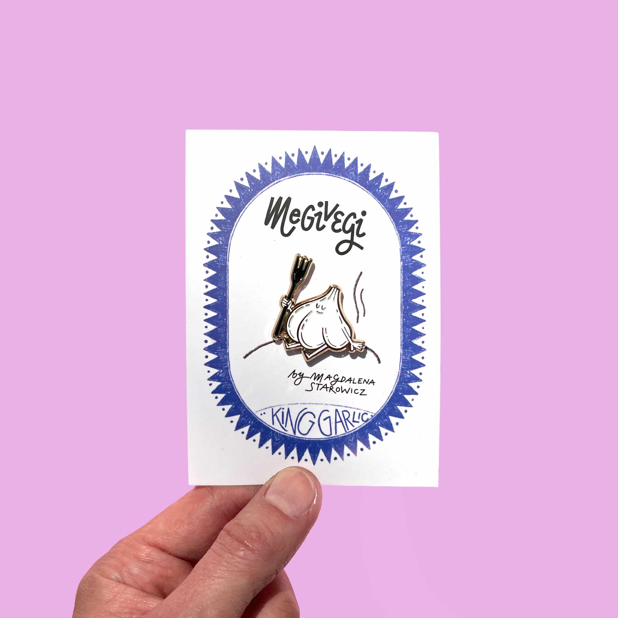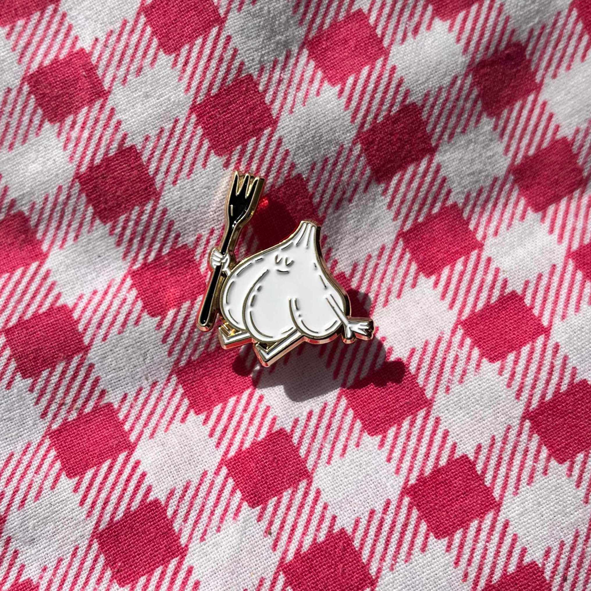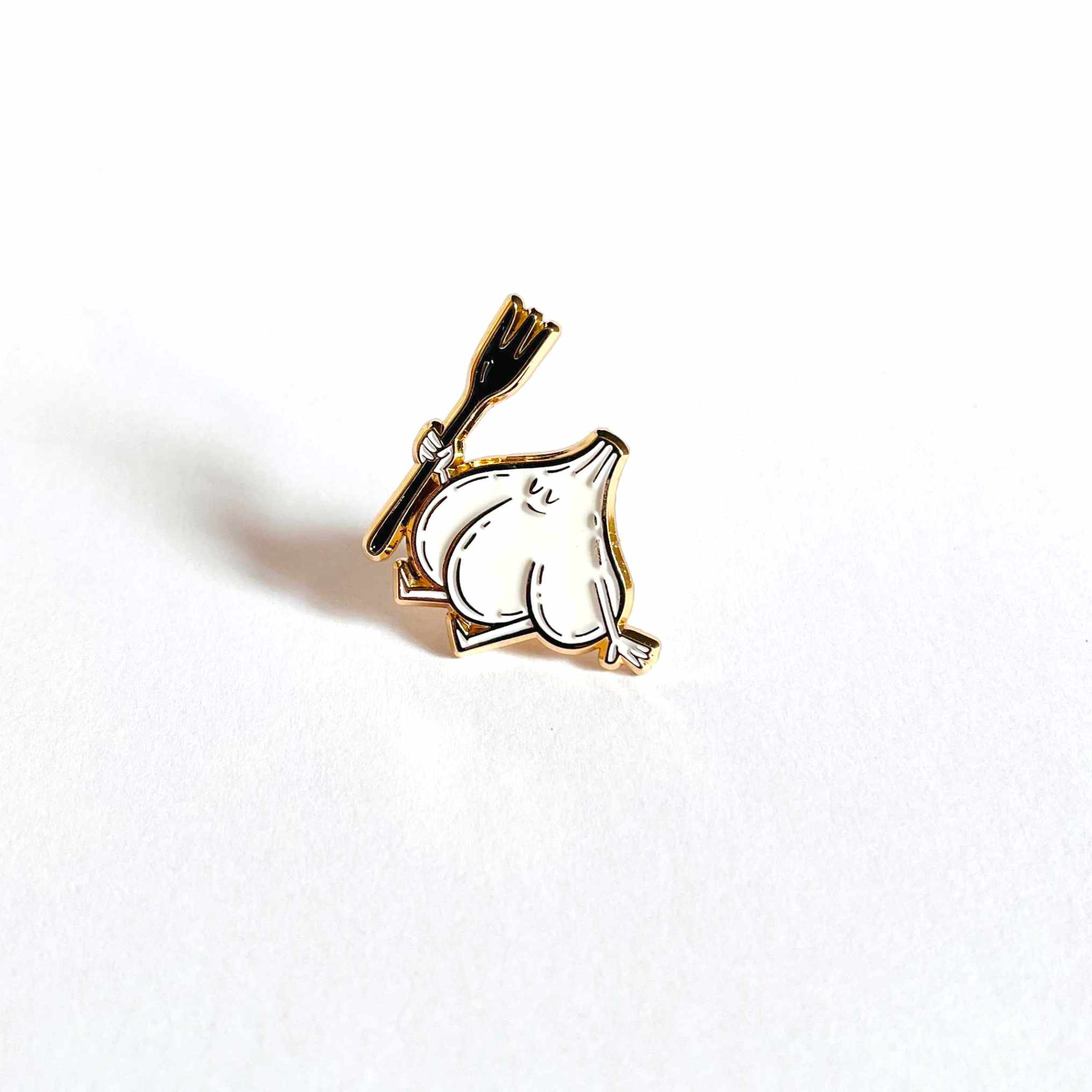 A stylish garlic-shaped enamel pin made from high-quality materials.
